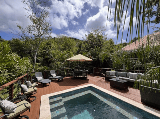 This two-bedroom two-bathroom St John vacation rental features a gourmet kitchen, large decks on both levels, and a hot tub with views of the Caribbean.