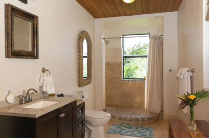 Crafted by local artisans from island stone and slate, Cara Mia has a charm and warmth all its own, with a covered gallery for al fresco dining. Relax in the island breezes or enjoy your meal in air conditioned comfort with the home's indoor or outdoor dining areas. Three equal, air-conditioned bedrooms are placed for optimum privacy and all are oriented to take advantage of Pt. Rendezvous' constant trade winds and inspiring ocean vistas, The master suite is complete with a king size bed, and an elegant bath with an opulent shower area. The guest bedrooms offer king beds and both are beautifully appointed and offer tasteful, oversize bathrooms ensuite. AC in Kitchen/Great room too as well as a whole house generator when the island's power company experiences one of their hiccups.