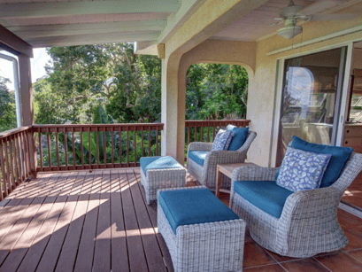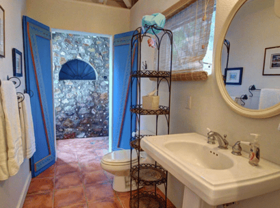 San Costanzo is an airy two-bedroom two-bathroom villa in Fish Bay that offers stunning views of the Caribbean Sea and Ram Head, lovely breezes, and simple elegance. There are large decks on both levels, and a hot tub with Caribbean views. The upper level features an open layout with a large great room with cathedral ceilings, a gourmet kitchen, a master bedroom and a custom rock shower with views of Fish Bay. The lower level, accessed by exterior stairs, has a master bedroom with a king bed and a mini-kitchen. Both bedrooms have individual split system air-conditioning units and open onto decks with views of Fish Bay.