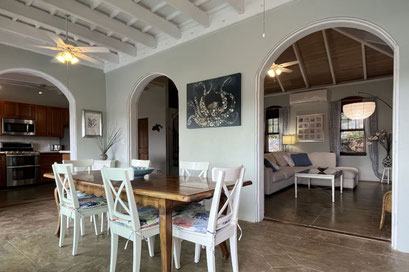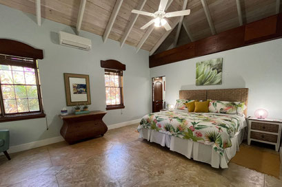 If you have stayed with us before, and we know many of you do, you'll be in for a real treat on your return! In total, the property has 3 bedroom + bath suites and an additional half bath, located as follows: The main villa has 2 bedroom and bathroom suites, both offering king size beds, double vanity bathrooms & private outdoor showers. One of the suites can have the king converted to two twin beds if needed. There is also a half bath in the main house. The pool cabana is home to the 3rd bedroom suite, and is located off of the pool deck. It too has a king size bed, central air, fantastic views of Hart Bay, full bathroom and a sliding glass door to a private water view deck. Both the main house and cabana offer beautiful wood plank cathedral ceilings, cool stamped concrete floors, full central air throughout including common areas, ceiling fans and fantastic ocean breezes if you prefer to have the windows open with the screens on, gorgeous turquoise water views, and a 30ft pool with large sundeck. It all works to create a space you won't want to leave!